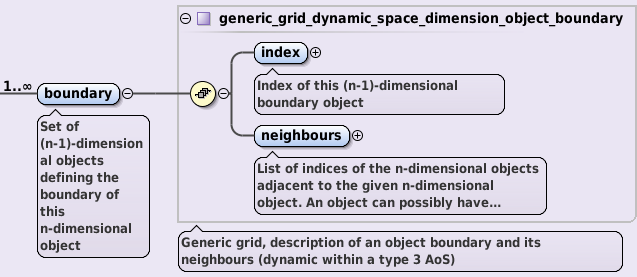 The child AOS of the object AOS is boundary AOS, describing a set of \({n-1}\) dimensional objects defining the boundary of given n-dimensional object which can additionally characterize the grid. Boundary represents a list of \({n-1}\) dimensional components defining the n dimensional object or bounds of the \({n}\) dimensional object inside the grid. For example, the boundary of an edge object would be two points/nodes, while the boundary of a 2D quadrilateral cell object would be four edges. The boundary AOS children are: