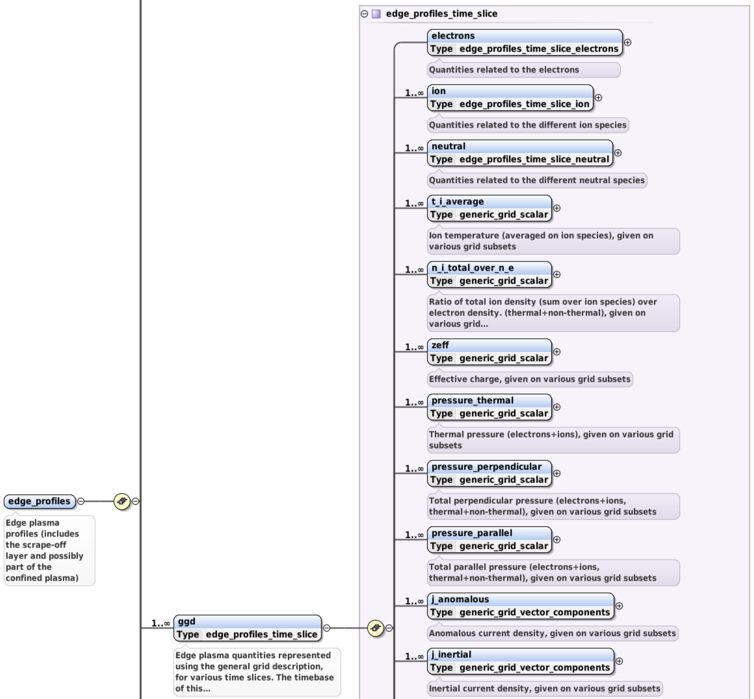 The ggd AOS holds the plasma quantities represented using the Generalized Grid Description for various time slices. The quantities correspond directly to one of the grid subsets (e.g. 100 values corresponding to grid subset composed by 100 points). ggd AOS contents differ between IDSs and usually it contains many child nodes/AOSs however the same rules apply to all.