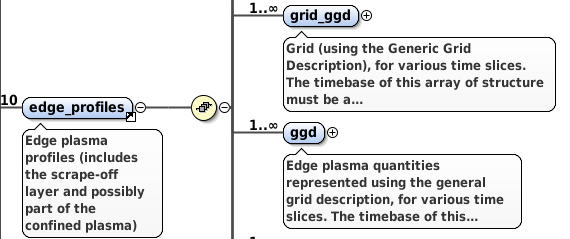 Overview (partial) of the edge_profiles IDS ggd AOS with belonging children including electrons node and ions AOS (as seen in the Oxygen XML Editor).
