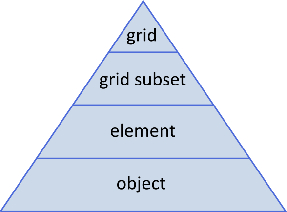 Hierarchy scheme of grid and grid components (grid subset, element, object).