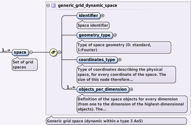 Overview of the space AOS displaying identifier node, geometry_type node, coordinates_types leaf and objects_per_dimension AOS (as seen in the Oxygen XML Editor).